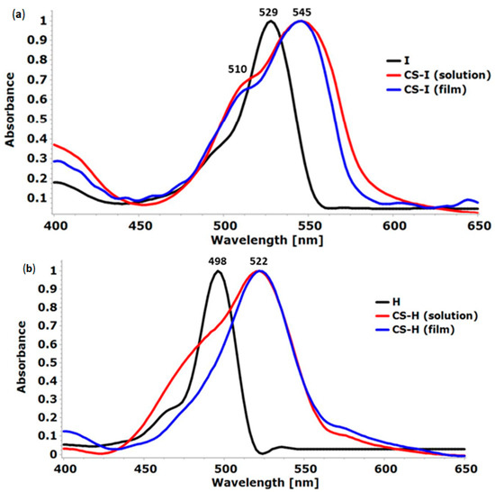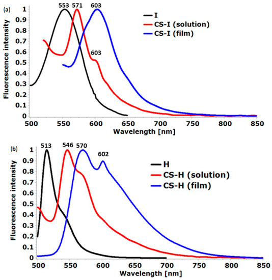 The emission spectra of the samples in the solutions (I, H—in acetone, CS-I, CS-H—in 1% CH3COOH + acetone) and in the solid films (CS-I, CS-H) were recorded with the use of the Jasco FP-800 spectrofluorimeter (Tokyo, Japan) in the visible range of 400–900 nm. The dye concentrations in the solutions were chosen so that the emission intensity was within the scope of 0.1–0.2. The concentration obtained by diluting the solutions was 1.5625 × 10−4 M and 3.125 × 10−4 M for I and H, respectively.