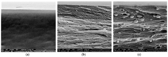 SEM images of a cross-section of chitosan (a), CS-I (b), and CS-H (c) films at 50,000× magnification.