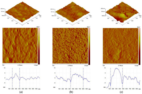 3D-AFM (upper panel), phase AFM images (middle panel), and cross-sections (bottom panel) of chitosan (a), CS-I (b), and CS-H (c) films for a 1 × 1 µm2 scan area.