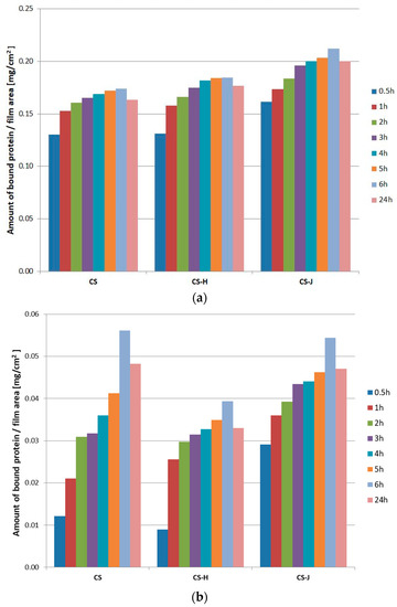 Two types of protein: human serum albumin (HSA) and α-acid glycoprotein (AGP), have been used to determine the interaction with BODIPY-modified chitosan films. The research results indicate that human serum albumin interacts better with chitosan films doped with dyes than with pure chitosan (Figure 9a). The increase in adsorbed HSA protein was observed up to 6h of incubation. However, after 24 h of the test, desorption of HSA from the composites was noted. This is convenient, due to the fact that the protein-bound drug should be released as the plasma concentration of the free fraction of the drug decreases. The reversible binding of plasma proteins by the resulting composites is therefore promising, in terms of pharmacological properties. The chitosan composite (CS-I) with the addition of dye I was the best for the adsorption of human serum albumin, among those three materials.