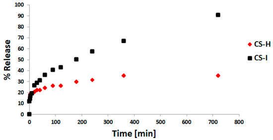The release kinetics of BODIPYs from the studied chitosan matrix is shown in Figure 10. As can be seen, the H dye is released much more slowly than the I dye. The concentration of this compound in the extract was noticeable after 5 min of the study, but the increase in its amount over time was relatively slow. Following 12 h of the study, its released amount constituted 35% of the mass of the H dye introduced into the sample. The I dye is released from the chitosan film much faster. Its release efficiency after 12 h is already 90%. The difference in the release rate of these two similar compounds is undoubtedly due to the presence of large iodine atoms in CS-I, which may constitute steric hindrances in intermolecular interactions. This probably makes it difficult for I dye molecules and CS macromolecules to move closer to each other, and therefore, a looser structure is formed. Thus, this dye is well dispersed in the chitosan matrix and more labile. Moreover, the lack of heavy atoms in the structure of the H dye causes the formation of larger dense clusters in the solid state (confirmed by SEM microscopy), from which the dye is released more slowly. Moreover, the particles of this dye can partially penetrate the chitosan random coils, from which they are eluted for a longer period of time by methanol.