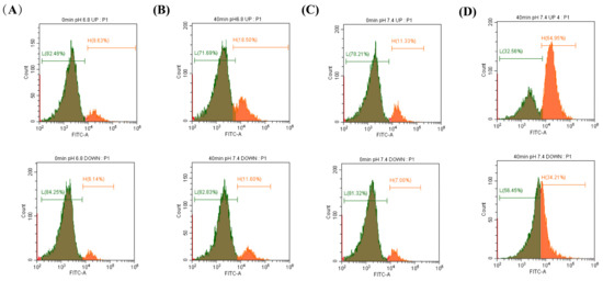 The changes in [Ca2+]i concentration during sperm incubation were detected by flow cytometry. (A–D) Proportion of sperm with high calcium ion concentrations in the upper and lower diluents when sperm were incubated at pH 6.8 and 7.4 for 0 min and 40 min.