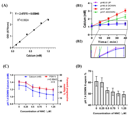 The OCPC colorimetric method was also used to detect the [Ca2+]i concentration in the sperm, and the standard curve was established as y = 2.475x + 0.03945 (R2 = 0.9924) (Figure 3A). These results were consistent with those from flow cytometry (Figure 3B1,B2). When NNC was added during incubation at pH 7.4, it was found that the calcium ion concentration and the proportion of forwardly motile sperm in the lower layer of spermatozoa decreased with an increase in the NNC concentration (r = 0.9943), and the proportion of X-chromosome-bearing sperm also decreased with an increase in the NNC concentration (Figure 3C,D). (Detailed data in sheet 2 of S1)