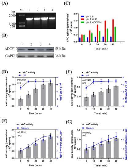 (A) Gel electrophoresis of the PCR amplification product of the sAC gene in dairy goat sperm. (B) Western blot of sAC from dairy goat sperm. (C) Changes in sAC protein activity when sperm were incubated in pH 7.4 dilution. (D,E) Relationship between sAC protein activity and pHi during sperm incubation. (F,G) Relationship between sAC protein activity and [Ca2+]i concentration during sperm incubation.