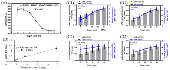 According to the instructions of the cAMP content detection kit and the PKA activity detection kit, the standard curve of cAMP content and OD533nmRFU was established using the following standard: y = −3.1477x4 + 88.341x3 − 207.08x2 − 1150.8x + 3137.9, R2 = 0.9912 (Figure 5A). A standard curve of PKA concentration versus OD450nmRFU was established as follows: y = 0.0543x + 0.1771, R2 = 0.9936 (Figure 5B). When incubated at pH 7.4, the correlation coefficients between the sAC activity of the upper and lower layers of spermatozoa and the cAMP content of the corresponding layer were r = 0.9780 and r = 0.9938, respectively, and those between the sAC activity of the upper and lower layers of the spermatozoa and the corresponding PKA protease activity were r = 0.9869 and r = 0.9979, respectively (Figure 5C1,C2,D1,D2).