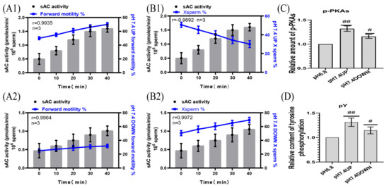 The pPKAs and pY contents of the sperm incubated at pH 7.4 were significantly higher than those incubated at pH 6.8 (Figure 6A1,A2,B1,B2). When incubated at pH 7.4, the correlation coefficients between the sAC activity of the upper and lower layers of spermatozoa and the proportion of forward motility were r = 0.9935 and r = 0.9964, respectively, and those between the sAC activity of the upper and lower layers of the spermatozoa and the proportion of X-chromosome-bearing sperm were r = −0.9892 and r = 0.9972, respectively (Figure 6C,D). (Detailed data in sheet 4 of S1)