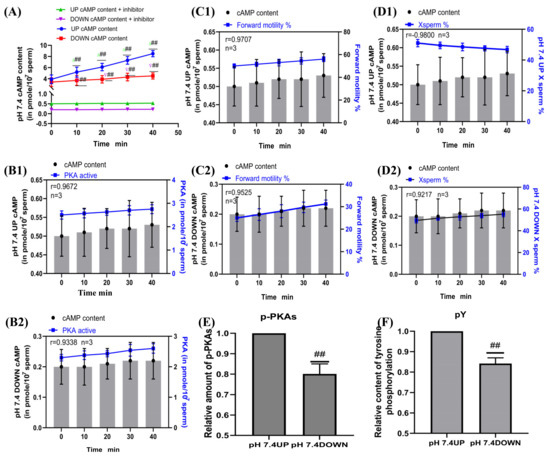 SQ22536 was added to the pH 7.4 dilution solution to inhibit the cAMP content of sperm, and samples were incubated for 40 min. The sperm cAMP content in the upper and lower layers of the test tube in the inhibitor group was significantly decreased compared with that in the no inhibitor group (p < 0.01) (Figure 7A). When incubated at pH 7.4, the correlation coefficients between the cAMP content of the upper and lower layers of the spermatozoa and the PKA activity of the corresponding layer were r = 0.9672 and r = 0.9338, respectively (Figure 7B1,B2). When incubated at pH 7.4, the correlation coefficients between the cAMP content of the upper and lower layers of the spermatozoa and the proportion of forward motility were r = 0.9707 and r = 0.9525, respectively, and those between the cAMP content of the upper and lower layers of the spermatozoa and the proportion of X-chromosome-bearing sperm were r = −0.9800 and r = 0.9217, respectively (Figure 7C1,C2,D1,D2). When sperm were incubated at pH 7.4, the contents of p-PKAs and pY in the upper sperm were significantly higher than those in the lower sperm (p < 0.01) (Figure 7E,F).