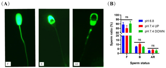 Detection of sperm capacitation status after incubation. (A) CTC staining method to evaluate sperm capacitation. F = live/non-capacitated sperm, B = live/capacitated sperm, and AR = acrosome-reacted sperm. (B) Statistics of capacitation status after sperm incubation. (ns) indicates no significant difference between the two groups (p > 0.05).