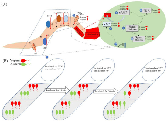 Schematic diagram of the mechanism by which diluent pH affects sperm motility. (A) Changes in pHi, [Ca2+]i concentration, and motility-related protease activity of X/Y-chromosome-bearing sperm during incubation in the alkaline diluent, with numbers indicating the order of changes within sperm. (B) Dairy goat sperm samples were incubated with pH7.4 dilution, the tubes were tilted at 45° and placed in a 37 °C incubator. The pHi of the sperm was about 5.0 at 0 min, and the ratio of X/Y-chromosome-bearing sperm in the upper and lower layers of the test tube was equal. The pH of the sperm increased to 6.9 after 10 min of incubation and remained unchanged thereafter, with a higher proportion of sperm in the lower layer than in the upper layer. When incubated for 40 min, the number of sperm in the lower layer and the proportion of X-chromosome-bearing sperm were significantly higher than those in the upper layer.