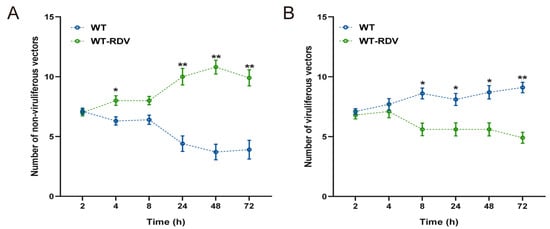 Feeding preference of non-viruliferous (A) and viruliferous N. virescens (B) between WT and WT-RDV rice plants. RDV, rice dwarf virus; WT, wild type (Minghui63, MH63) (RDV-free); WT-RDV, MH63-RDV (RDV-infected). All feeding choice assays were performed with fifteen biological replicates, each of the fifteen new emergent adults. The statistical differences between the two treatments in the same column were indicated by asterisks (* p < 0.05; ** p < 0.01, Wilcoxon’s signed-ranks tests). Data are mean ± standard error.
