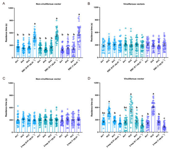 Behavioral responses of N. virescens when exposed to individual VOCs. Residence time in the four-field olfactometer as in Figure 2. The effects of three doses of (E)-β-caryophyllene on non-viruliferous N. virescens (A) (0.01 μg μL−1, n = 42; 0.1 μg μL−1, n = 42; 1 μg μL−1, n = 42) and viruliferous N. virescens (B) (0.01 μg μL−1, n = 40; 0.1 μg μL−1, n = 40; 1 μg μL−1, n = 39). The effects of three doses of 2-heptanol on non-viruliferous N. virescens (C) (0.01 μg μL−1, n = 38; 0.1 μg μL−1, n = 40; 1 μg μL−1, n = 41) and viruliferous N. virescens (D) (0.01 μg μL−1, n = 36; 0.1 μg μL−1, n = 36; 1 μg μL−1, n = 37). EBC, (E)-β-caryophyllene odors; 2-heptanol, 2-heptanol odors; Air1, clean air; Air2, clean air; Air3, clean air. Deviations from equal distributions were analyzed with a Friedman–ANOVA (p < 0.05). Bars annotated with different letters are significantly different from each other (Wilcoxon–Wilcox test). Data are mean ± standard error.