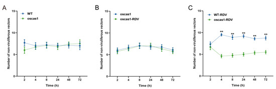 Previous research showed that oscas1 rice plants infected with RDV could not emit more EBC [26]. Therefore, we used oscas1 mutant rice plants to verify the attraction of EBC to non-viruliferous N. virescens with feeding and plant odor preference studies. There was no significant preference for feeding selection by non-viruliferous N. virescens between WT (RDV-free) and oscas1 (RDV-free) rice plants, or between oscas1 (RDV-free) and oscas1-RDV (RDV-infected) rice plants during the entire investigation (Figure 4A,B, p > 0.05). In contrast, the number of non-viruliferous vectors was more abundant on WT-RDV (RDV-infected) rice plants than that on oscas1-RDV (RDV-infected) rice plants (except for 2 h PI, P = 0.475) (Figure 4C).