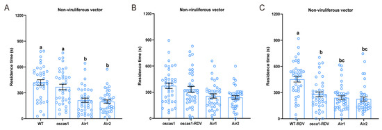 A four-quadrant olfactometer with four arenas (Camsonar SIM-4, Camsonar Group Limited, UK) was used to determine the effects of host plant odors on the olfactory behavior of both non-viruliferous and viruliferous N. virescens, as previously described [26]. Odor materials (WT, RDV-free rice plants; WT-RDV, RDV-infected rice plants; clean air) were individually transferred into a glass bottle (D = 10 cm, H = 60 cm). All devices were connected using odorless PVC tubes (TYGON, LMT−55, Tokyo, Japan). One non-viruliferous or viruliferous female adult (starved for 4 h) was placed into the olfactometer and after 5 min, the location and activity of the insect were recorded for 20 min (Figure S6). Data were analyzed using image-processing software (EthoVision XT 14, Noldus Information Technology, Wageningen, The Netherlands). A heat map was used to visualize the tracks made by the N. virescens in the four-odor area over the 20 min period (the same as below). If the residence time of the adult in the olfactometer was <95% of the total test time, the data were excluded. Forty-five biological replicates were carried out for each experiment.