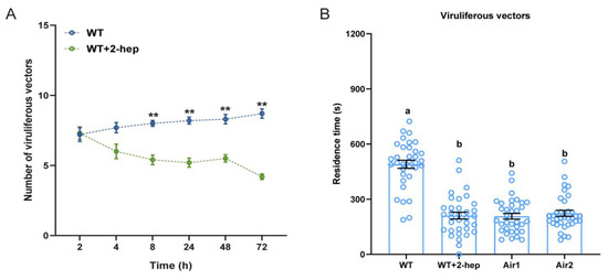 The effects of 2-heptanol sprayed on rice plants on the feeding and plant odor preferences of viruliferous N. virescens: (A) Feeding preference of viruliferous N. virescens between WT plants plus 10 μL pure lanolin paste (control plants) and WT plants plus synthetic 2-heptanol (2-hep, 8.17 μg) in 10 μL of lanolin (treated plants). WT, wild type (Minghui63, MH63) (RDV-free). All feeding choice assays were performed with fifteen biological replicates, each of fifteen newly emerged adults. The statistical difference between the two treatments in the same column is indicated by asterisks (** p < 0.01, Wilcoxon’s signed-ranks tests). Data are mean ± standard error. (B) Plant odor preference of viruliferous N. virescens between control plants and treated plants (n = 34). WT, WT plant odors; WT + 2-hep, WT plants plus synthetic 2-heptanol odors; Air1, clean air; Air2, clean air. Deviations from equal distributions were analyzed with a Friedman–ANOVA (p < 0.05). Bars annotated with different letters are significantly different from each other (Wilcoxon–Wilcox test). Data are mean ± standard error.