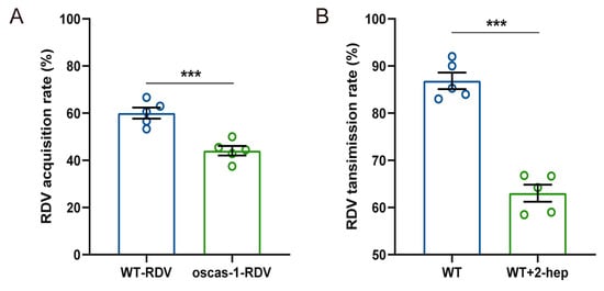 Two combinations of rice plants (WT-RDV vs. WT; oscas1 vs. oscas1-RDV) were conducted to test the RDV acquisition rate of non-viruliferous N. virescens. The final number of non-viruliferous vectors on WT-RDV (RDV-infected) rice plants was 30, 39, 33, 30, and 27, and on oscas1-RDV (RDV-infected) rice plants was 21, 18, 22, 20, and 24, respectively. The RDV acquisition rate of non-viruliferous N. virescens was 60.04% on WT-RDV and 44.05% on oscas1-RDV, and was significantly different (Figure 7A, t = 5.176, df = 8, P = 0.008). Similarly, the RDV transmission rate of viruliferous N. virescens fed on treated plants (WT + 2-heptanol) was 63.04% and on control rice plants (WT) was 86.86%, which was significantly different (Figure 7B, t = 9.436, df = 8, p < 0.001).