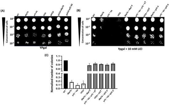 Specific yeast colonies were cultured for 48 h at 30 °C in liquid YPgal (YP + 2% galactose) media. Spot test analysis was performed by spotting serial dilutions of cell suspensions onto solid media with or without LiCl. For drug sensitivity analysis to LiCl, galactose media or glucose media containing 10 mM LiCl concentration was used, as discussed previously [13,18]. The ssensitivity of our target strains to LiCl was determined by examining the growth of gene deletion mutants compared to those of the wild type (WT) strain. To validate that the reported sensitivities correspond to the deletion of our candidate genes, overexpression constructs pDBP7 and pYRF1-6 were transformed into the target gene deletion strains. For colony count analysis, 100 μL of each strain at 10−4 cell culture concentration was plated onto YPgal petri plates with or without LiCl. The plates were evaluated based on colony formation after 48 h. All the experiments were carried out in triplicates. To evaluate statistical significance, one-way ANOVA analysis (p-value ≤ 0.05) was performed. For Phenethyl Isothiocyanate (PEITC) sensitivity analysis, liquid cultures were normalized to OD 0.1 and plated onto a YPD medium with 15 µM PEITC.