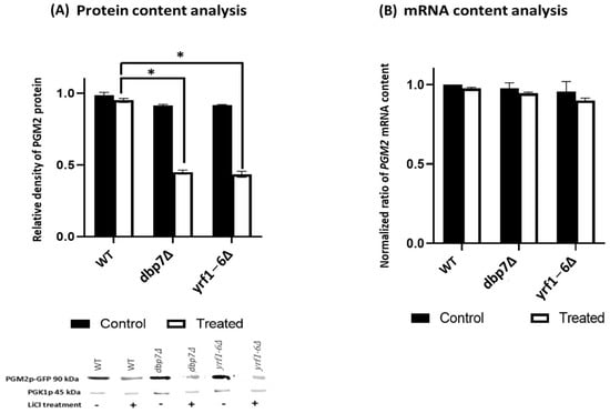 PGM2p-GFP protein and PGM2 mRNA content were examined using western blot and qRT-PCR with and without LiCl treatment (A) In the deletion strains DBP7 and YRF1-6, the amount of PGM2p-GFP protein is reduced by LiCl treatment. As an internal control, the housekeeping protein PGK1p was employed, and the data was standardized based on it. (B) There was no statistically significant variation in mRNA content across the yeast variants studied. Individual Ct values in this experiment were between 20 and 22.5. PGK1 mRNA was used as an internal control. All experiments were carried out in triplicates. The bars reflect the mean values (n ≥ 3), the error bars represent the standard deviation, and the ‘*’ indicates statistically notable outcomes compared to the WT.