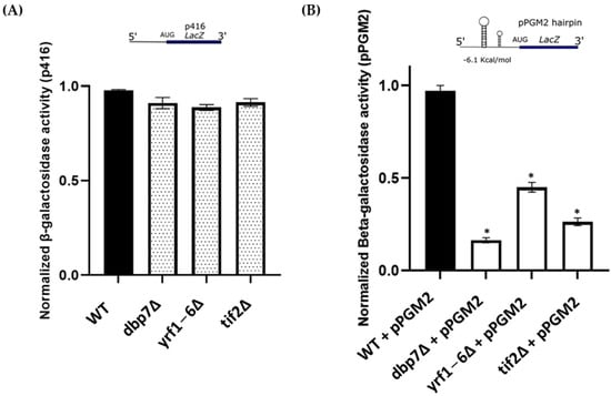 β-galactosidase analysis of our candidate gene deletions carrying the construct p416, with and without PGM2 hairpin. (A) Yeast strains carrying intact p416 construct lacking a secondary structure upstream of the lacz reporter mRNA. β-galactosidase activity observed for the yeast mutant strains and WT had no significant difference. (B) Yeast strains carrying a modified p416 construct with PGM2 mRNA 5′-UTR structure upstream of the lacz reporter mRNA. Β-galactosidase activity was reduced in the tif2∆, dbp7∆, and yrf1-6∆ strains compared to the WT. Bars represent mean values (n ≥ 3), and ‘*’ represents statistically significant results compared to the WT. The insets illustrate schematic reporter mRNA structures.