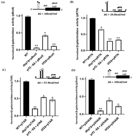 The impact of DBP7 and YRF1-6 on other structured mRNAs was then investigated. A total of four additional constructs were used in this experiment, each of which carried a unique structure at their 5’-UTR in front of a lacz reporter gene. pBcell has a structure derived from BCL2 mRNA with a ∆G value of −20 kcal/mol. pRTN contains a structured 5’-UTR from RTN4IP1 mRNA with a ∆G value of −29.8 kcal/mol, and the pTAR structure is obtained using HIV1 mRNA with a ∆G value of −57.9 kcal/mol. The final construct, p2hair, has a synthetic structure with a high degree of complexity, ∆G = −33 kcal/mol. Using these constructs, we observed that deleting DBP7 and YRF1-6 considerably lowered the lacz expression carrying all four highly structured mRNAs at their 5′-UTR compared to the WT (Figure 4). This indicates that our target genes DBP7 and YRF1-6 may play a broader role in the translation, specifically in the translation of structured mRNAs.