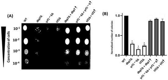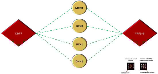 Phenotypic suppression array (PSA) analysis explores a different type of interaction where the overexpression of a target gene compensates for the absence of another, under a specific condition [22,61,62,63]. It is an informative type of interaction because it may reveal functional associations between two genes. In this analysis, the gene mutant array was subjected to 10 mM LiCl. Several tested mutant strains demonstrated greater cell sensitivity. We then sought to compensate for the reported sensitive phenotypes using the introduction of DBP7 and YRF1-6 overexpression plasmids. As mentioned above, colony size was used to measure phenotypic fitness. The incorporation of DBP7 or YRF1-6 overexpression plasmid recovered the cell sensitivity caused by LiCl treatment in four gene deletion mutant strains MRN1, GCN2, BCK1, and DHH1 (Figure 8). MRN1 encodes an RNA-binding protein that regulates translation by binding to specific categories of mRNA that include uORFs and IRES motifs [64,65]. GCN2 encodes for a protein kinase found in cytosolic ribosomes that controls translation initiation by phosphorylating the translation initiation factor eIF2 and influences the overall translation rate [66]. BCK1 encodes for a kinase which influences several cellular processes, including translation [67]. DHH1 is a cytoplasmic DEAD-box helicase that facilitates mRNA stability, mRNA degradation, and polyadenylation at the 5′-UTR of mRNAs [68].