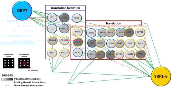 To study GIs in yeast, two mating types: α-mating type (Mat α) and a-mating type (Mat a), are commonly utilized. Mat “α” contains the target gene deletion and is crossed with an array of Mat “a” single gene deletion to create double gene deletions [25]. The phenotypic fitness of the strains is measured using colony size. We used this approach to look for genetic links between our target genes, DBP7 and YRF1-6, and nearly 1000 other genes, including ~700 linked to gene expression pathways and a random sample group of ~300 genes used as control (See Table S1). We uncovered a series of intriguing nGIs as well as multiple shared gene hits between DBP7 and YRF1-6 (See Table S2). A substantial proportion of these hits are linked with translation and translation initiation, as determined using the functional enrichment analysis (Figure 6).