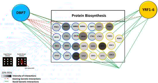 Conditional nGI occurs when a specified condition is met, enabling an interaction. Such conditions may include nutrient deprivation/starvation, exposure to cold or heat shock, or the occurrence of a bioactive chemical at a sub-inhibitory concentration. They indicate functional connections between genes that develop in response to specific environments [43,44]. For instance, under specific conditions such as DNA damage, certain gene function(s) may be modified, and these varied activities are functionally connected to the activity of an interacting partner. Such case-dependent relationships constitute the foundation of conditional nGIs [45]. In our analysis, with a sub-inhibitory drug concentration of LiCl (3 mM), we evaluated nGIs for DBP7 and YRF1-6 (See Table S3). The nGIs observed in this circumstance are formed in response to exposure to LiCl. As illustrated in Figure 7, we found new nGIs for our candidate genes DBP7 and YRF1-6.