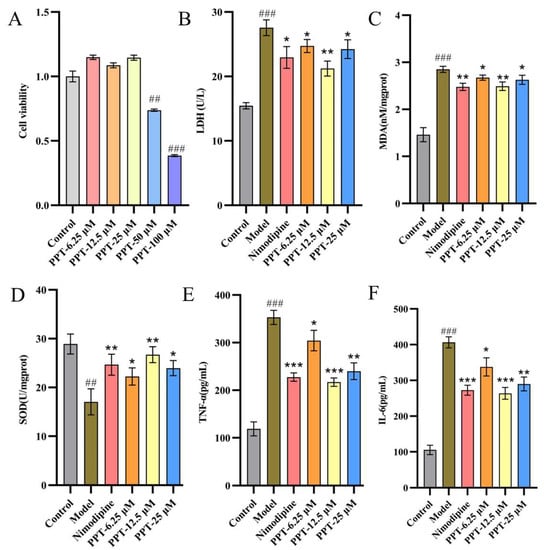 (A) The impact of PPT on the viability of PC12 cells. (B–F) Effects of PPT on LDH, MDA, SOD, TNF-α, and IL-6 levels in OGD-P12 Cells. (n = 6); Compared with the control group, ## p < 0.01, ### p < 0.001; compared with the model group, * p < 0.05, ** p < 0.01, *** p < 0.001.