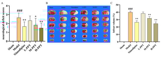 The TTC-staining infarct volume of each group was shown in Figure 2B,C, no infarct area was observed in the brain tissue of the rats in the sham group. The results demonstrated that the infarct volume in all the treated groups was lower than those of the Model group. Specifically, the infarct volumes in the groups that were treated with H-PPT and M-PPT or nimodipine were significantly lower than that of the model group (p < 0.05).