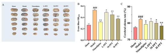 Effect of PPT on blood-brain barrier disruption (n = 3). The staining and content determination of Evans blue in different groups (A,B). The change in cerebral edema rate in different groups (C). ### p < 0.001 vs. sham. * p < 0.05, ** p < 0.01 vs. model group.