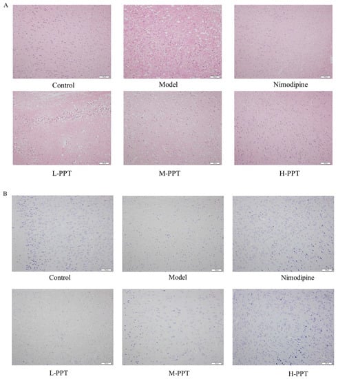 As shown in Figure 4A, hematoxylin and eosin (H&E) staining of the cerebral cortices of the sham group demonstrated an intact cortical structure with intact cell nuclei and homogeneous cytoplasm, compared with the control group, there are large number of vacuoles and nuclear shrinkage in the cortex and striatum of the model group, with irregular shapes and partial nuclear chromatin dense and dense shrinkage, partial nuclear pyknosis occurs, and a lot of damage occurs. Pretreatment with H-PPT, M-PPT, and nimodipine successfully reversed the CIR-induced histopathological changes. Whereas, pretreatment with L-PPT did not have obvious neuroprotective effects.
