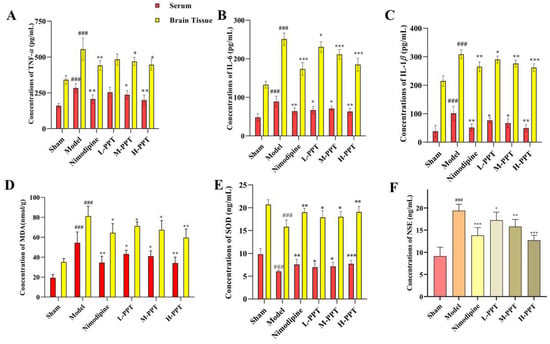Each biomarker’s concentration in the sham, model, and H-PPT groups’ serum (A) and brain (B). Data are presented as means ± SD (n = 6). Compared with control group, # p < 0.05, ## p < 0.01, ### p < 0.001; compared with model group, (* p < 0.05, ** p < 0.01, *** p < 0.001).