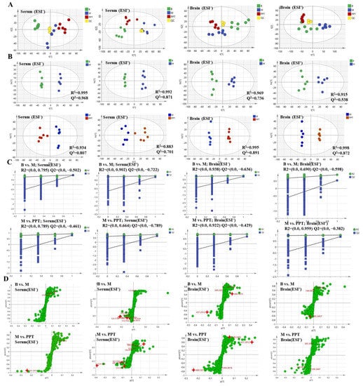 The metabolic profile of serum and brain are shown in PCA score (A), OPLS-DA score (B), permutations test plots (C), and OPLS-DA S-plots (D). “B” represents sham group; “M” represents model group.