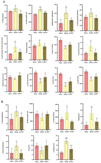 Disorders of the sphingolipid metabolism are closely related to a variety of neurodegenerative diseases, which may lead to their complex pathogenesis [43]. Sphingosine is a bioactive substance that has a role in cell differentiation, autophagy, transcription, and apoptosis, all of which are connected to inflammatory disorders [44]. Sphingosine 1-phosphate is a bioactive sphingolipid metabolite that plays a regulatory role in neurotransmitter release, synaptic transmission, and neuroinflammation [45]. In the CIR model group, we found that the content of metabolites of Sphingosine, Sphingosine 1-phosphate, and 3-Dehydrosphinganine increased significantly, indicating that sphingolipid metabolism was affected, which is consistent with a previous report [46], and the accumulation of sphingolipid metabolites led to brain damage. After treatment with H-PPT, the levels of the three metabolites all decreased, tending to the sham group.