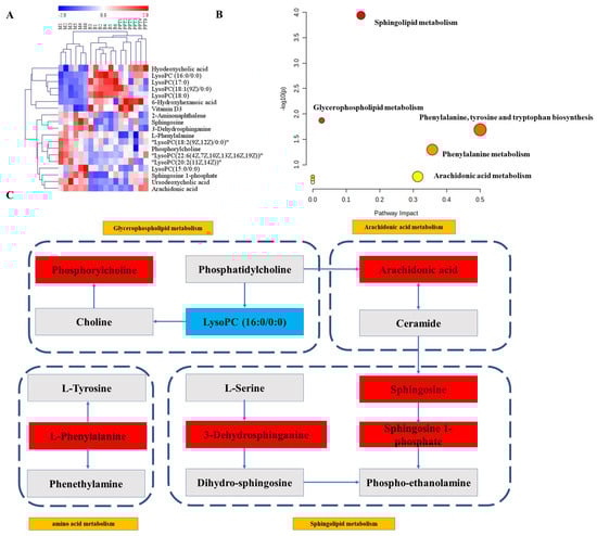 (A) The heat map of biomarkers. (B) Effects of PPT on main metabolic pathways in UC. (C) The metabolic network between main biomarkers and metabolisms.