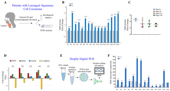 SMN is overexpressed in laryngeal squamous cell carcinoma. (A) Schematic representation of this pilot study. Within a cohort of 20 patients with LSCC, sample tissues from n = 16 patients were subjected to protein analysis, sample tissues from n = 14 patients were subjected to RNA analysis, and sample tissues from n = 2 patients to fluorescence microscopy. (B) Densitometric analysis of immunoblots using an anti-SMN monoclonal antibody. In each sample, SMN immunoreactivity was normalized to that of glyceraldehyde 3-phosphate dehydrogenase (GAPDH). SMN protein levels in the sample from tumor tissues (Ts) are expressed as the fold change compared with the sample from normal adjacent tissues (Ns). The number (#) identifies patients in Table 1. The graph illustrates the mean of three independent experiments. Error bars represent s.d. Asterisks indicate significative differences using unpaired t-test (*** p < 0.01). (C) Comparison of the SMN protein fold changes in different stages of laryngeal cancers. The box-and-whiskers graph shows the median, interquartile range, minimum, and maximum from the following number of patients per group: n = 2 for stage II; n = 4 for stage III; n = 6 for stage IVA; n = 4 for stage IVB. Data are analyzed by one-way ANOVA–Bonferroni’s multiple comparisons test. Mean ± s.d. are illustrated. No significative differences are observed between the different stages. (D) Densitometric analysis of immunoblots using antibodies against SMN, RPS6, EGFR, or E-cadherin. The immunoreactivity for each protein was normalized to that of GAPDH. Protein levels in tumor tissues (Ts) are ex-pressed as fold change compared with normal adjacent tissues (Ns). The mean of three independent experiments is shown in logarithmic scale (log2). Error bars represent s.d. (E) Diagram illustrating the main experimental steps of Droplet Digital PCR (ddPCR). (F) SMN mRNA expression levels (mean ± S.D.) measured by ddPCR comparing normal tissue (N) with tumor tissue (T) samples. The number (#) identifies patients in Table 1. Statistical significance of differences was evaluated by ANOVA followed by Bonferroni’s post-test: *** p < 0.001; * p < 0.05 (for each normal vs. tumor sample).