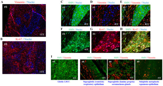 SMN protein is enriched in neoplastic cells of the laryngeal tissue. (A,B) Representative images of fluorescence microscopy. De-paraffinized sections of LSCC from patient #1 were stained with an anti-Ki67 antibody or an anti-vimentin antibody. Nuclei were labeled with DAPI (blue). Images were acquired with a 10× objective, as indicated. (C–H) Representative images of immunofluorescence analysis visualizing the localization of SMN protein. De-paraffinized sections of LSCC tissue from patient #1 were subjected to dual immunostaining for SMN (green) and vimentin (red) (upper panel, C–E), or SMN (green) and Ki67 (red) (bottom panel, F–H). Nuclei were stained with DAPI (blue). (I) Representative images of the immunofluorescence for SMN (green) and vimentin (red). Different types of epithelial cells identified in LSCC tissue from patient #5 are displayed. Images were acquired with a 40× objective.