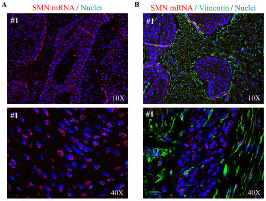 SMN mRNA localization in laryngeal squamous cell carcinoma. (A) Representative images of fluorescence microscopy. SMN mRNA (red dots) was detected by a padlock assay in LSCC tissue from patient #1. Nuclei were stained with DAPI (blue). Images were acquired with a 10× or 40× objective. (B) Representative images of fluorescence microscopy. LSCC sections were subjected to a combination of vimentin immunostaining (green) and a padlock assay targeting SMN mRNA (red). Nuclei were stained with DAPI (blue). Images were acquired with a 10× or 40× objective, as indicated.