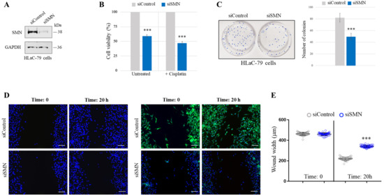To gain insights into the role of the SMN in LSCC, we conducted in vitro studies using HLaC-79 cells, a LSCC cell line [33,34]. For loss-of-function studies, we reduced the expression levels of endogenous SMNs by the transient transfection of HLaC-79 cells with SMN1-selective small interfering RNAs (siSMN). Scrambled siRNAs were used as a control (siControl) (Figure 4A). First, we evaluated the impact of SMNs on HLaC-79 survival and proliferation. We found that SMN knockdown affects the viability of HLaC-79 cells, as assessed by an MTT assay (Figure 4B, Untreated). Since cisplatin is the anticancer drug for advanced HNSCC, we also checked the viability of SMN-depleted cells upon cisplatin treatment (10 μg/mL) for 24 h. In our system, as revealed by an MTT assay (Figure 4B, +Cisplatin), SMN knockdown increased the sensitivity of HLaC-79 cells to cisplatin. In addition, we carried out a cell colony formation assay and observed that SMN knockdown reduced the colony-forming capability of HLaC-79 cells (Figure 4C). We next assessed the impact of SMN function on cellular migration. By a wound-healing assay, we quantified wound closure rates, 20 h after scratch, in both siSMN- and siControl-transfected cells. Remarkably, SMN knockdown significantly reduced the wound closure rate, in comparison with the control (Figure 4D,E), suggesting that the SMN contributes to the migratory capability of HLaC-79 cells.
