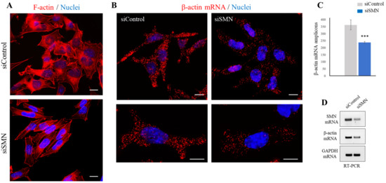 It has been established that β-actin plays an essential role in regulating cell migration [35,36]. Notably, our previous study showed that SMN is required for the proper remodeling of actin filaments [16]. Based on these assumptions, we asked whether SMN knockdown may perturb actin dynamics in a laryngeal carcinoma cell line. To this end, we probed actin filaments (F-actin) with phalloidin and imaged cells by a fluorescence microscope (Figure 5A). Comparing siControl- and siSMN-transfected HLaC-79 cells, we observed that SMN knockdown changed actin cytoskeleton organization. As showed in Figure 5A, F-actin staining was reduced upon SMN depletion, indicating defective actin filament polymerization. Given the functional and physical link between the SMN protein and β-actin mRNA [12,16], we explored the effects of SMN depletion on β-actin transcript in HLac-79 cells. Images generated by padlock assays suggested that SMN knockdown caused a reduction in β-actin mRNA (Figure 5B,C). To further validate this result, we checked and compared the abundance of β-actin mRNA by a semiquantitative RT-PCR (Figure 5D and Figure S3). The biochemical approach agreed with our padlock images, suggesting that SMN-deficient HLaC-79 cells undergo perturbed β-actin dynamics.