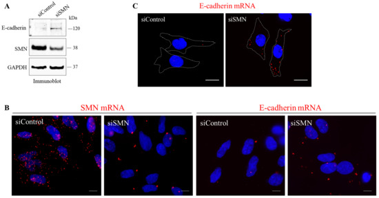 It is known that reduced E-cadherin expression allows the conversion of static and polarized epithelial cells into dynamic and invasive cells [37]. Notably, as above reported, LSCC exhibited a downregulation of E-cadherin protein, compared to normal adjacent tissues (Figure 1D and Figure S1). Therefore, in HLaC-79 cells we considered it interesting to explore a possible link between the SMN and E-cadherin. First, by Western blot we checked E-cadherin protein abundance in both siControl- and siSMN-transfected cells. In control cells, E-cadherin was almost undetectable. Interestingly, protein extracts from SMN-depleted cells were immunoreactive to the E-cadherin antibody (Figure 6A). To corroborate this result, we looked at E-cadherin mRNA. We designed padlock probes selectively targeting E-cadherin transcript or SMN transcript. Following padlock experiments, both siControl- and siSMN-transfected cells were visualized by fluorescence microscopy. Consistent with the siRNA-mediated silencing of SMN, images generated from the SMN padlock showed a strong reduction in the fluorescent dots per cell, in comparison to siControl-transfected cells (Figure 6B). In parallel, we probed E-cadherin mRNA. We observed that SMN knockdown caused an upregulation of E-cadherin mRNA (Figure 6B,C). Interestingly, as above reported, an inverse correlation between SMN and E-cadherin expression levels was also observed in LSCC (Figure 1). Collectively, these results provide evidence that SMN unequivocally plays a role in cell migration and adhesion in LSCC cells.