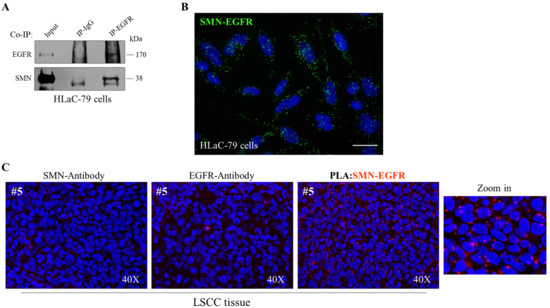 EGFR overexpression occurs with high frequency in HNSCC [7]. Identifying modifier genes of the EGFR expression/pathway could improve therapeutic treatments for this aggressive cancer type. Given the ability of SMN to physically associate with cell surface proteins [16], we explored a potential SMN-EGFR interaction in the laryngeal carcinoma context. First, we subjected HLaC-79 cells to a canonical co-immunoprecipitation assay. As shown in Figure 7A, a pool of SMN protein co-precipitated with the EGFR, indicating a physical association between these proteins. The biochemical data were supported by co-localization images showing intracellular sites in which the EGFR and SMN signals appeared overlapped (Figure S4). We also performed an in situ proximity ligation assay (in situ PLA), which generates fluorescent dots in fixed cells only when two proteins are closer than 40 nm. Several PLA puncta were diffusely distributed within HLaC-79 cells (Figure 7B), indicating the existence of SMN-EGFR complexes. PLA images not only confirmed co-immunoprecipitation results, but also showed the ability of SMN protein to contact the EGFR in different cellular districts. Indeed, it is known that SMN shares different subcellular compartments with the EGFR, including the plasma membrane, cytoplasm, and nucleus [38]. Remarkably, an interaction between the SMN and EGFR in LSCC tissues was suggested by co-localization images (Figure S5) and confirmed by in situ PLA (Figure 7C). Even though preliminary and limited to LSCC, these findings identified the EGFR as a novel interaction partner of SMN.