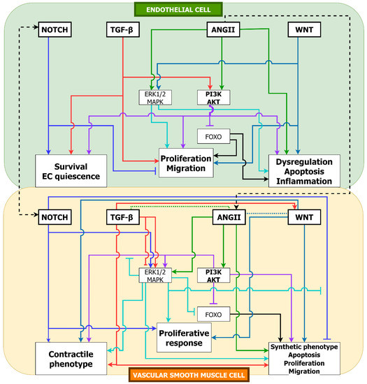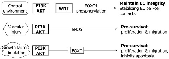 | Pathway | Promote survival and EC quiescence | Promote proliferation and migration | Promote EC dysregulation, apoptosis, and inflammation | |||