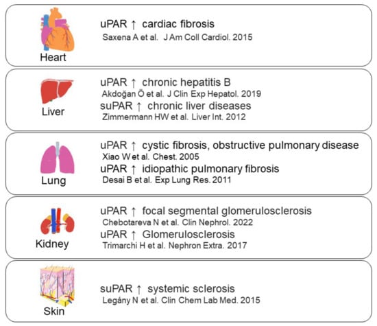 - Rasmussen, L.J.H.; Petersen, J.E.V.; Eugen-Olsen, J. Soluble Urokinase Plasminogen Activator Receptor (suPAR) as a Biomarker of Systemic Chronic Inflammation. Front. Immunol. 2021, 12, 641. [Google Scholar] [CrossRef]