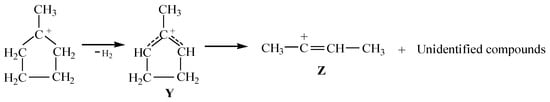 stretch vibration of allyl cation (CH2CHCH2)+ has a lower frequency [20], at 1303 cm−1. Therefore, it can be assumed that the Y+ cation is of the allyl type. It forms from the alkyl cation of methyl-cyclopentyl+ in a solvent medium and, being unstable, subsequently decomposes into butylene cation Z and other products (Scheme 1).