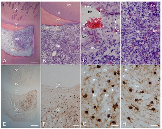 Histopathological characterization of inflamed human dentin–pulp complex by hematoxylin and eosin (HE) staining and the expression of mast cell tryptase (MCT) in cells from consecutive sections of inflamed human dental pulp. In deep dentin caries of the dentin–pulp complex, the carious dentin lesion sites (cd) with destroyed primary dentin, secondary dentin (srd), and the formation of reactive tertiary dentin (rtd) are visible (A). The structural and cellular order of the healthy dentin–pulp complex is not visible in the carious dentin–pulp complex (A,B). Beneath the carious lesion, there are severe chronic and acute inflammatory areas with numerous different inflammatory cells and dilated blood vessels (B–D). Neutrophilic granulocytes (arrows) associated with numerous erythrocytes (asterisks) are found in the lumen and wall of the blood vessels (C). In the consecutive section of the inflamed human dental pulp, MCT is detected in mast cells within chronically and acutely inflamed areas, which are seen in the overview (E) and detailed images (F–H). The mast cells are associated with blood vessels, which contain numerous erythrocytes (asterisks; G,H). Scale bars: (A,E) = 500 µm; (B,F) = 100 µm; (C,D,G,H) = 30 µm.