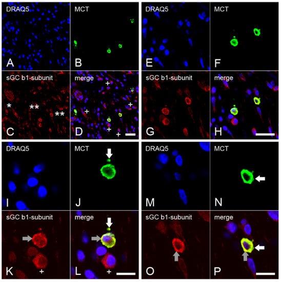 The presence of numerous nuclei of inflammatory cells detectable by DRAQ5 indicated severe inflammation in the dental pulp (Figure 4A,E,I,M). MCT was detected in a small subpopulation of inflammatory cells showing a large cytoplasm and nuclei, whereas the other inflammatory cells contained small and round nuclei (Figure 4B,F,J,N). In some inflammatory cells, the sGC β1 subunit was identified with MCT at a weak staining intensity (Figure 4C), while a stronger intensity was detected in some other inflammatory cells (Figure 4C,G,K,O). In the double stainings, the sGC β1 subunit in mast cells colocalized with MCT in one subpopulation (Figure 4D,H,L,P), whereas no colocalization was observed in the other subpopulations of inflammatory cells (Figure 4D,H,L).