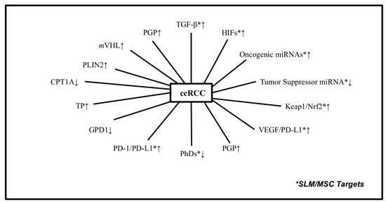 Molecular and immunologic targets expressed in ccRCC tumors and associated microenvironment implicated in tumor angiogenesis, unstable microenvironment, drug resistance, and immune evasion. TGF-ß, transforming growth factor-ß; HIFs, hypoxia-inducible factor1α/2α; onco-miRs, oncogenic microRNAs; TSmiRS, tumor-suppressor microRNAS; P-gp, p-glycoprotein; PHD, prolyl hydroxylase; PD-1/PD-L1, programmed death-1 and its ligand; GPDL1, glycerol-3-phosphate dehydrogenase 1-like; TP, thymidine phosphorylase; CPT1A, carnitine palmitoyl transferase IA; PLIN2, Perilipin 2; mVHL, mutated Von Hippel-Lindau tumor-suppressor gene; ↑ upregulated; ↓ downregulated. *: SLM/MSC targets.