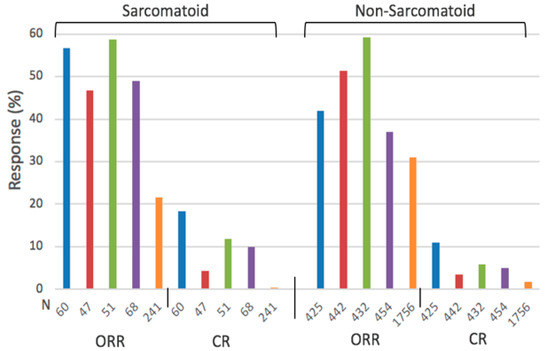 Clear cell renal cell carcinoma (ccRCC) represents over 75% of RCC, is highly immunogenic, and is molecularly, immunologically, and histologically heterogeneous. Although mutation or inactivation of the Von Hippel-Lindau (VHL) tumor-suppressor gene is considered the hallmark of ccRCC, the second most mutated gene after VHL is PBRM1 [6,7,8,9,10]. Histologically, 5–15% of ccRCC express sarcomatoid features, which hold a unique molecular and immunological profile. While non-sarcomatoid ccRCC is generally considered chemotherapy-resistant, efficacy to specific types of chemotherapeutic agents alone and in combination with targeted molecules demonstrated some degree of efficacy with dose-limiting toxicity. Four phase III trials have been completed that evaluated the combination of VEGF/VEGFR-targeted therapy and immune checkpoint inhibitors (biologic molecules) vs. targeted therapy alone, namely with sunitinib, and results have been collected in untreated sarcomatoid and non-sarcomatoid ccRCC [1] (Table 2). For the 1753 patients without sarcomatoid differentiation treated with the combination of biologic-targeted molecules, the reported intention-to-treat (ITT) responses were as follows: overall response rate (ORR), complete response rate (CR), median progression-free survival (mPFS), and median overall survival (OS) were 47.4%, 6.3%, 12.1 months, and 34.8 months, respectively. For the 1756 patients without sarcomatoid differentiation treated with sunitinib alone, the reported ORR, CR, mPFS, and mOS were 30.9%, 1.8%, 9.1 months, and 30.8 months, respectively. For the 226 patients with sarcomatoid differentiation treated with the combination of biologic molecules, the ORR, CR, mPFS, and mOS were 52.8%, 11.1%, 7.9 months, and 24.8 months, respectively. For the 241 patients with sarcomatoid differentiation treated with sunitinib alone, the reported ORR, CR, mPFS, and mOS were 21.5%, 1.4%, 5.7 months, and 14.3 months, respectively. Collectively, the data in Figure 2 and Table 2 indicate that both with and without sarcomatoid differentiation exhibited higher response rates with the combination of biologic-targeted molecules than with sunitinib alone (Figure 2). For patients with ccRCC treated with axitinib alone in second-line therapy, the reported ORR, mPFS, and mOS were 18%, 8 months, and 18 months, respectively [30,31].
