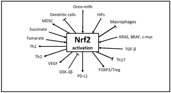 Biomarkers’ expression associated with the overexpressed nuclear factor erythroid 2-related factor 2 (Nrf2). ↑ Activator and inhibitor. Onco-miRs, oncogenic microRNAs; HIFs, hypoxia-inducible factor-1α/2α; KRAS, BRAF, c-myc, Kristen rat sarcoma virus, B-raf proto-oncogene, serine/threonine kinase, and c-myc is a proto-oncogene; TGF-ß, transforming growth factor-ß; Th17, T-helper 17 cells; Foxp3/Treg, transcription factor forkhead box protein/T regulatory cell; PD-L1, programmed death ligand 1; GSK-3ß, glycogen synthase kinase-3-beta; VEGF, vascular endothelial growth factor; Th1/2, T-helper-type 1/2 cells; MDSC, myeloid-derived suppressor cells [75].