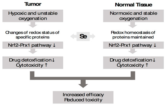 Differential regulation of Nrf2 expression by methylselenocystein (Se) in tumor and normal tissues [72]. Se upregulates Nrf2 in normal mouse tissues and downregulates its expression in tumor tissues.